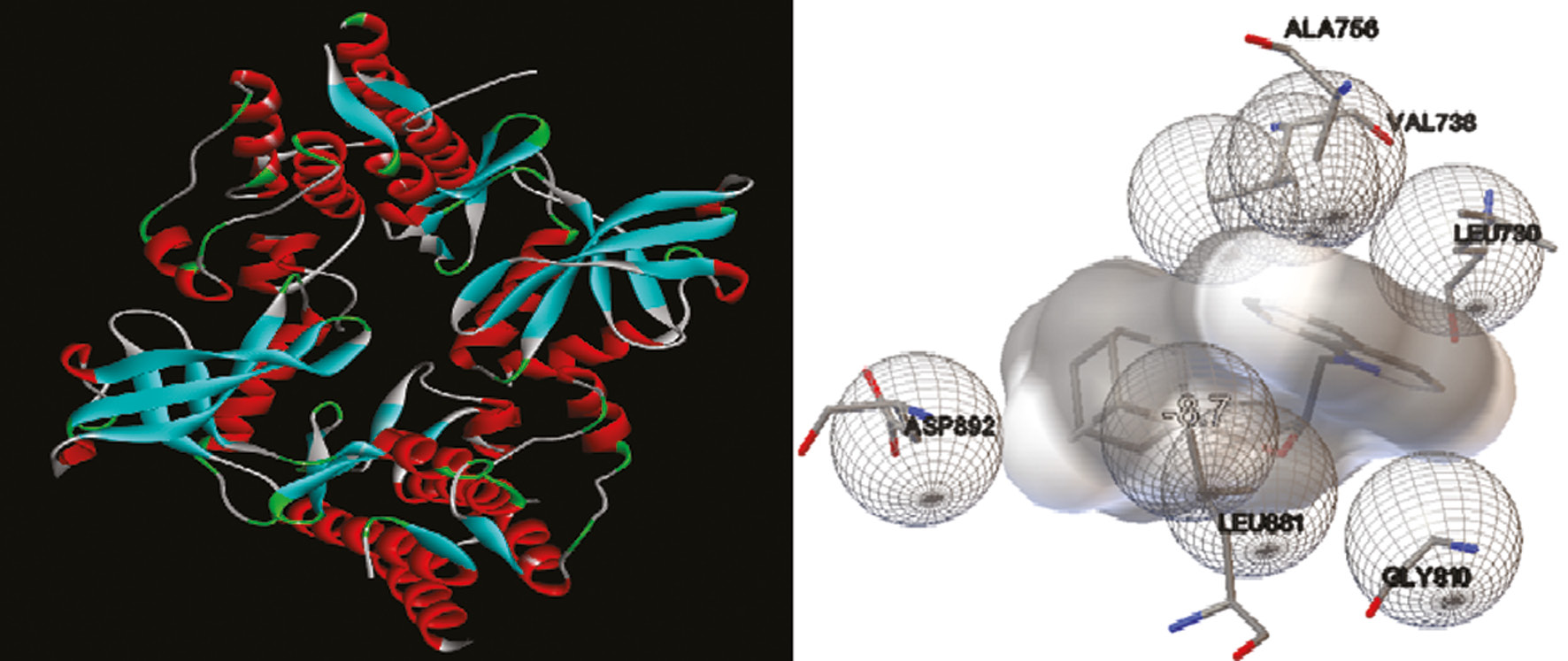 Рис. 3. Модель белка (RET) тирозинкиназы (слева) и изображение связывания молекулы лиганда 4г с остатками аминокислот белка с указанием энергии связывания (справа)
