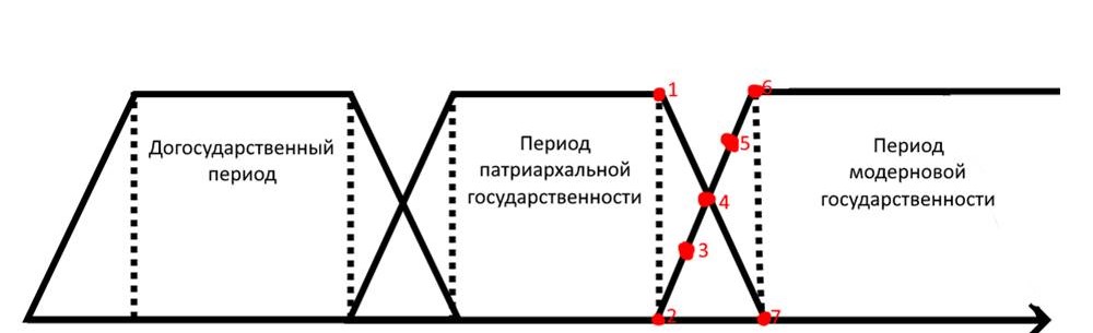 Рис. 1. Схема перехода политических систем с нумерацией ключевых событий: 1 ¬– начало процесса уничтожения удельной системы (лишение иммунитета Суздальско-Нижегородского княжества, 1448 г.); 2 – начало процесса создания служилой системы (создание государева поместья, 1478 г.); 3 – расширение публичной власти (создание служилых корпораций и их политических организаций, 1549 1552 г.); 4 – «Служилая» политическая революция 1607 1613 гг.; 5 – распад удельных отношений и укрепление служилых (процесс приравнивания поместья и вотчины, создание изолированной группы служилых людей, отмена местничества); 6 – утверждение модерного государства (учреждение Правительствующего Сената 1711 г., Табеля о рангах 1722 г.) 7 – исчезновение удельной системы (лишение иммунитета духовных феодалов 1701 1721 гг.