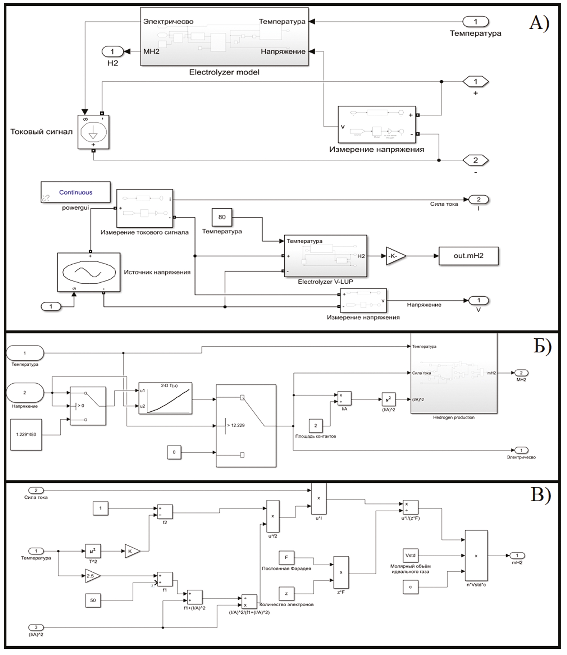 Выводы. Предложена система уравнений (2), (3), описывающая физико-химический процесс электролиза, который представляет собой широко распространенное технологическое решение по производству водорода как наиболее перспективного энергетического и материального ресурса в современной энергетике. Данные уравнения положены в основу разработанной в ППП MATLAB/Simulink имитационной структурной модели электролизной установки, которая верифицирована по экспериментальным данным и может быть использована для оптимизации режимов технологического процесса и построения САУ ключевыми параметрами процесса.