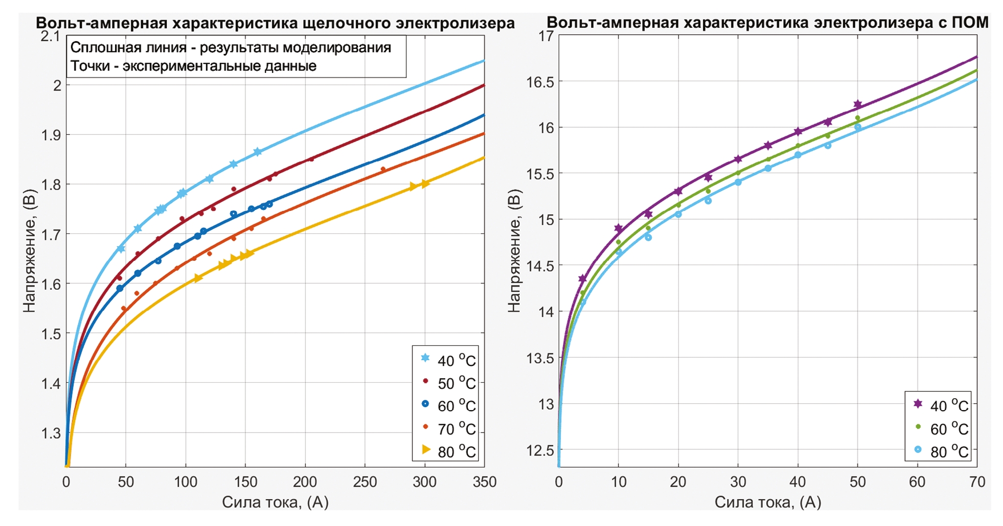 Эксперименты проводились для рассматриваемых типов электролизеров при различных температурах электролита или воды. Результаты моделирования показывают (см. рис. 2), что с повышением температуры электролита или воды понижается напряжение при равной плотности тока на электродах ЩЭ и электролизера с ПОМ, что свидетельствует о увеличении скорости химической реакции. Средняя ошибка моделирования процессов электролиза в установке с щелочной ячейкой составляет около 4 %, для установки с ПОМ — 2,7 %.