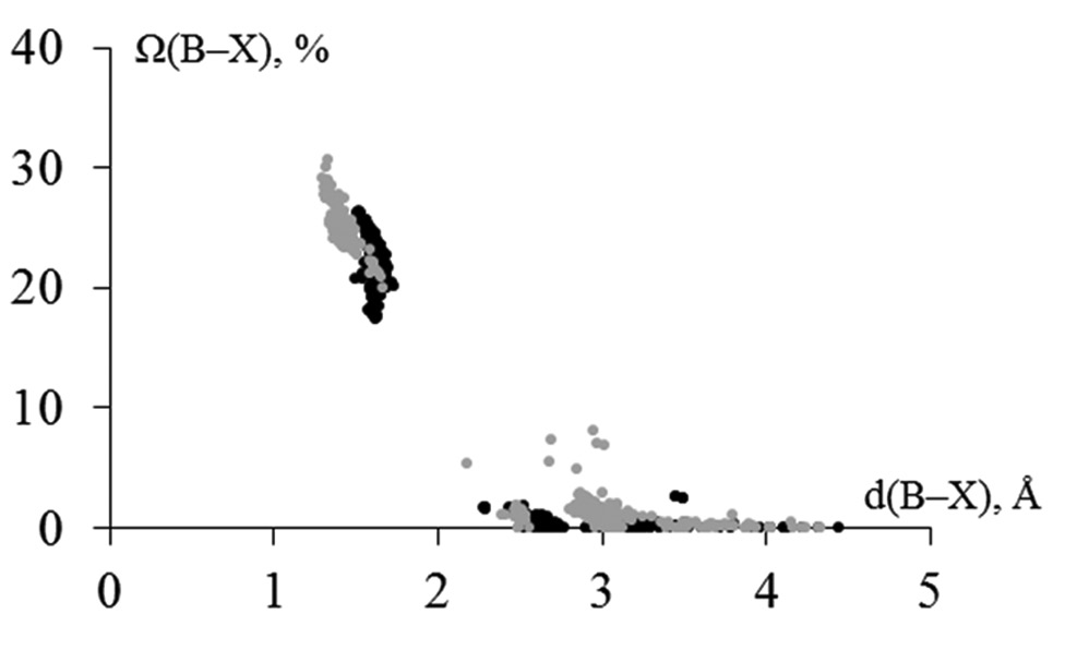 Рис. 1. График зависимости телесного угла Ω (выражен в% от 4π стерадиан) граней ПВД атомов B от межатомных расстояний B–X (черными кружками обозначены контакты с атомами углерода, а серыми кружками — с атомами фтора), соответствую- щих этим граням