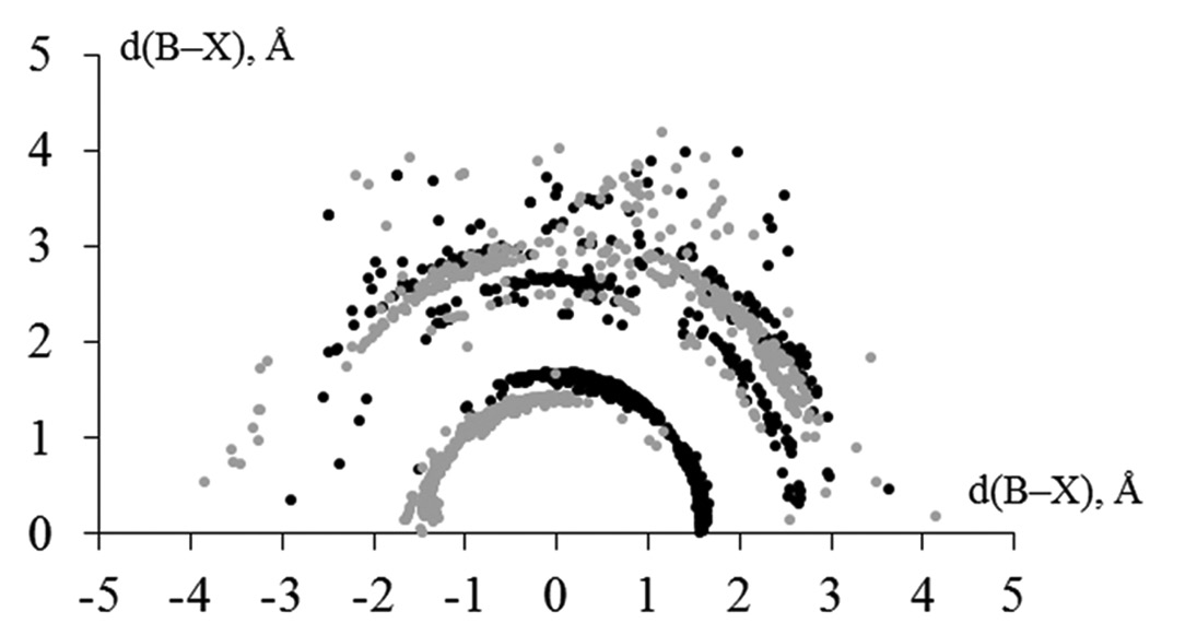 На рис. 2 показан график (d, φ)-распределения для комплексов BCnHalm, на котором химическим связям отвечают две полуокружности меньшего диаметра: первая соответствует валентным взаимодействиям B–C, а вторая — связям B–F. Диффузный слой отвечает невалентным взаимодействиям B/C и B/F.