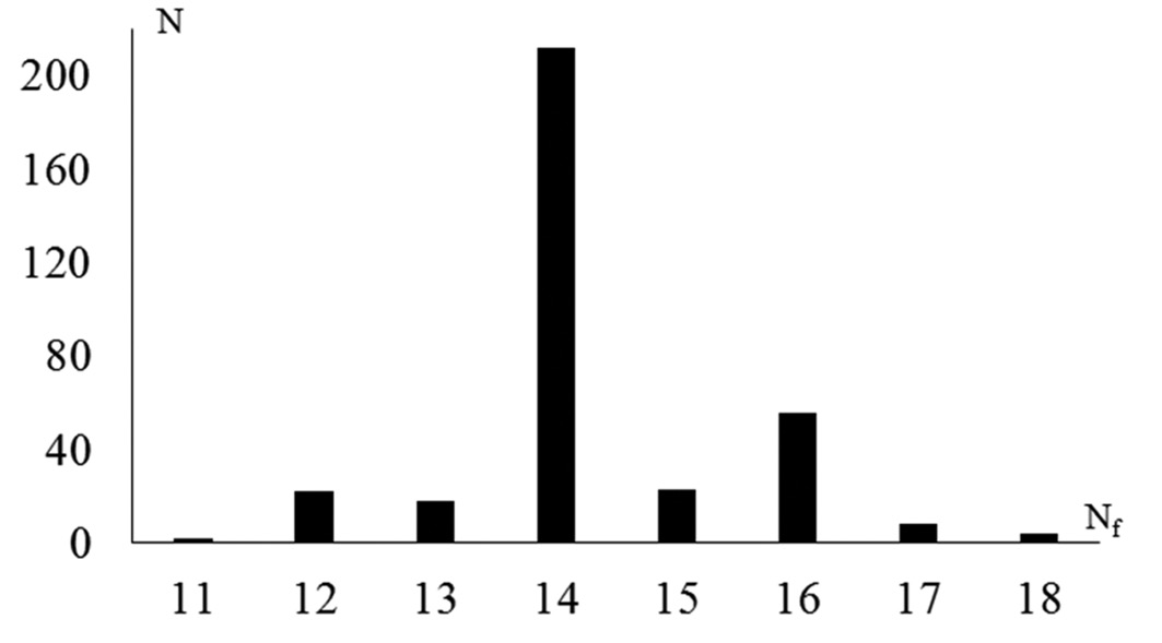 Рис. 3. Гистограмма распределения количества борорганических соединений (N) от числа соседей в подрешетках B–B (Nf)