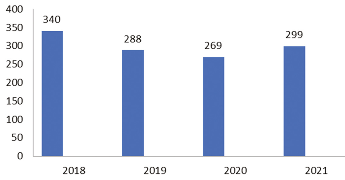 Методы. В 2021 году на железнодорожных переездах сети ОАО «РЖД» зарегистрировали 299 ДТП, которые произошли из-за нарушения правил дорожного движения водителями или неисправности автомобилей, что привело к столкновению с проходящими поездами. Эти данные были получены из оперативной информации (рис. 1).