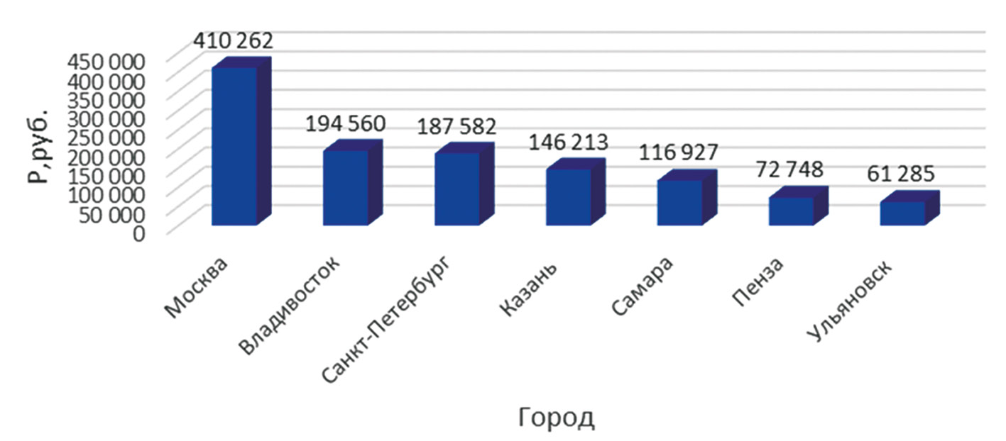 Согласно анализу цен РосРиэлт стоимость квартир в среднем по России в новостройках составляет 190 700 р/м2, вторичного жилья — 148 956 р/м2 [3]. В регионах средняя цена за 1м2 изображена на графике (рис. 1).