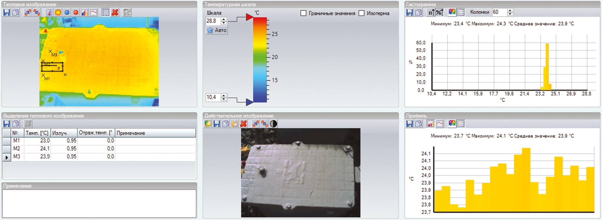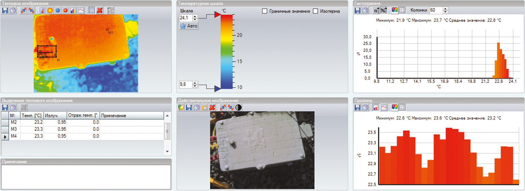 Результаты. По фотографии ДТ тепловизором определено место наибольшего нагрева, которое составило 24 °С, при температуре окружающего воздуха 22 °С. Максимальная температура дроссель-трансформатора до и после прохождения поезда изменилась незначительно и составила 1 °С, это объясняется незначительным значением тягового тока, протекающего по основной обмотке ДТ, при измерении токовыми клещами составило 200 А, что соответствует тоннажу поезда. Для сравнительного анализа в ходе эксперимента получены гистограммы, профиль изменения, граничные значения температуры и точки теплового отображения.