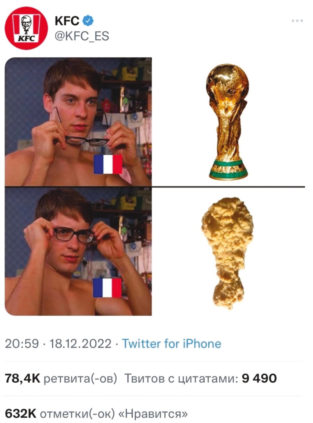 В ситуативном маркетинге мемы активно стали применяться чуть более десятилетия назад, а сейчас все бренды, нацеленные на молодежную аудиторию, пользуются этим инструментом. Так, например, после проигрыша французов Аргентине в финале Чемпионата мира в 2022 г. в твиттере KFC выложили известный мем из фильма «Человек-Паук» (рис. 1). На нем главный герой, рядом с которым разместили флаг Франции, без очков видит перед собой кубок мира, а надев их, понимает, что перед ним куриная ножка, напоминающая по форме главный трофей турнира. К своему посту контент-специалисты бренда добавили: «Вы все еще можете получить свой мини-кубок мира», попутно рекламируя свою продукцию. Как видим, этот ироничный пост был поддержан пользователями социальной сети: уже в первые часы он собрал 632 тыс. отметок «Нравится».