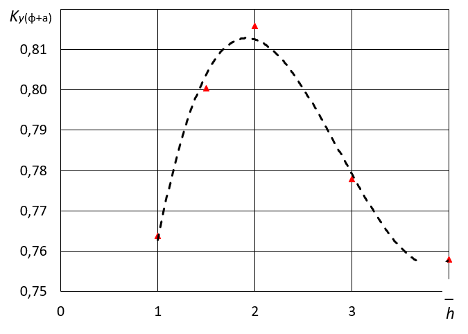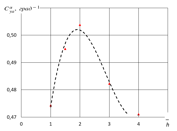 Результаты эксперимента (рис. 2) показали немонотонную зависимость коэффициента интерференции подъемной силы Ky(ф+а) от безразмерной высоты h− = h/r(где h — высота расположения антенны, расстояние от верхней поверхности фюзеляжа до горизонтальной плоскости симметрии антенны; r — радиус фюзеляжа), и монотонно возрастающую зависимость коэффициента интерференции лобового сопротивления Kx(ф+а) от безразмерной высоты пилона. Построена зависимость производной коэффициента подъемной силы по углу атаки от высоты расположения радиолокационного комплекса над фюзеляжем (рис. 3).