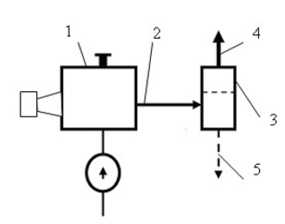 Рис. 1. Разработанная конструкция парового котла: 1 — котел и теплообменные поверхности; 2 — пароводяная пульпа; 3 — сепаратор; 4 — насыщенный пар для потребления; 5 — продувочная котловая вода