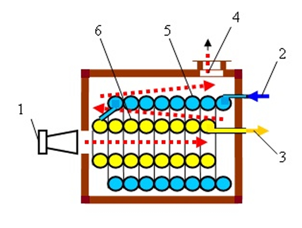 Рис. 2. Устройство конструкции парового котла, продольный разрез: 1 — горелка; 2 — входной патрубок питательной воды; 3 — выходной патрубок пароводяной пульпы; 4 — выход продуктов сгорания; 5 — спираль труб конвективного нагрева; 6 — спираль радиационных труб, образующих топку