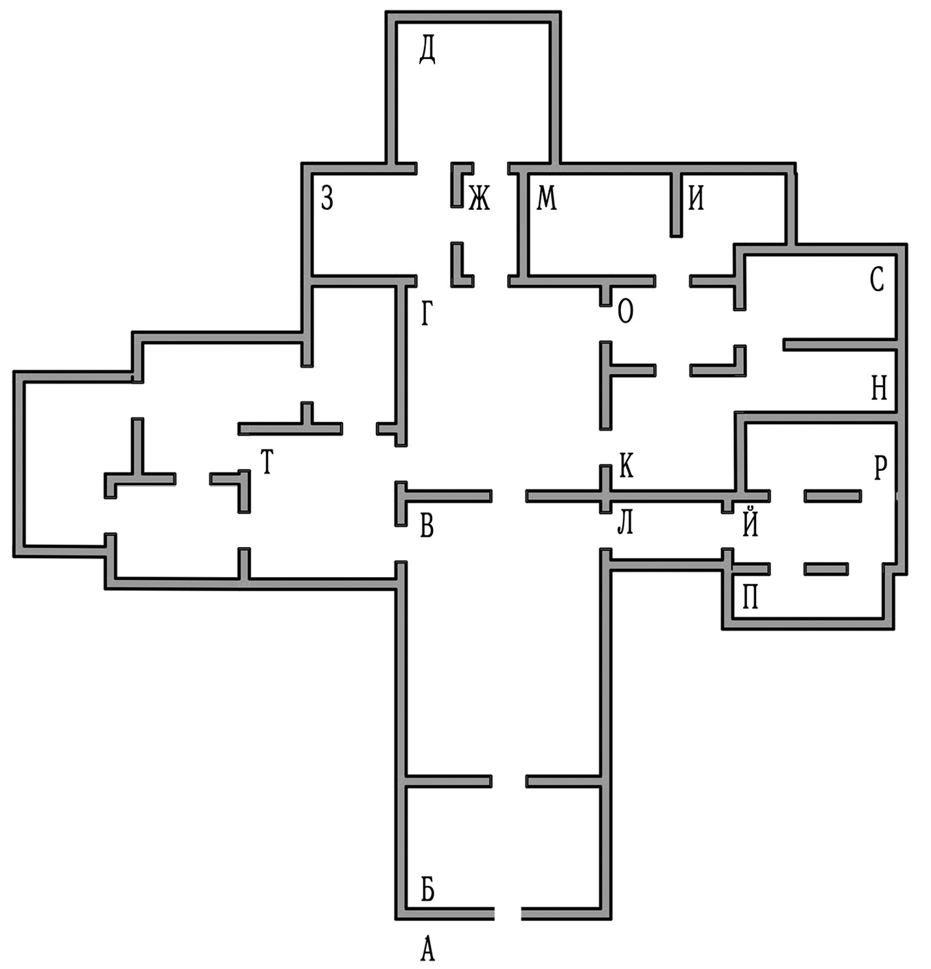 Рис. 1 Фрагмент реконструкции виллы. Чувственный подход. А – вход; Б – атрий; В – перестиль; Г – триклиний; Д – гимнасий; Е – площадка для игры в мяч; Ж – большая комната; З – малая комната; И – апсида; Й – прекрасно отделанная комната; К – комната для натираний; Л –прекрасно отделанная комната; М – комната, отделанная со вкусом; Н – комната с прихожей; О – фригидарий; П – спальня; Р – комната; С – пропнигий; Т – хозяйственная зона