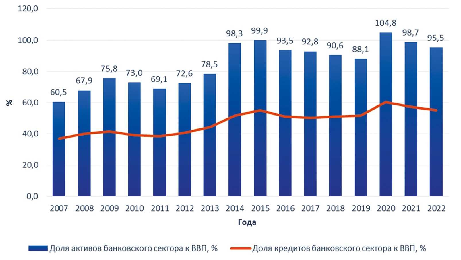 Рис. 1. Динамика совокупных активов, кредитов банковского сектора к ВВП