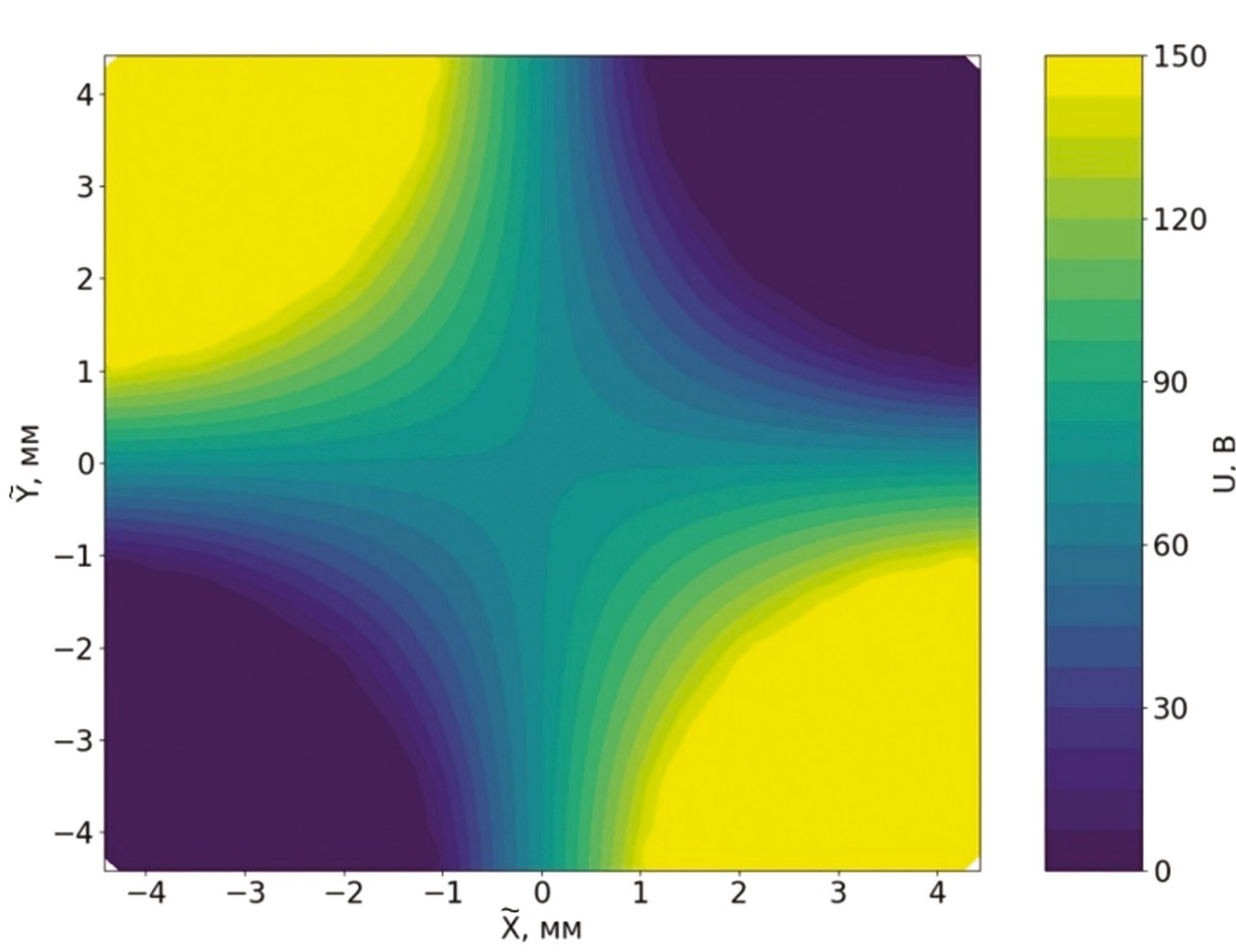 На рис. 1 представлено поле квадрупольной ловушки с концевыми электродами. График получен для центральной части ловушки. Видно, что поле не является симметричным: кривизна поля вдоль разных направлений отличается.