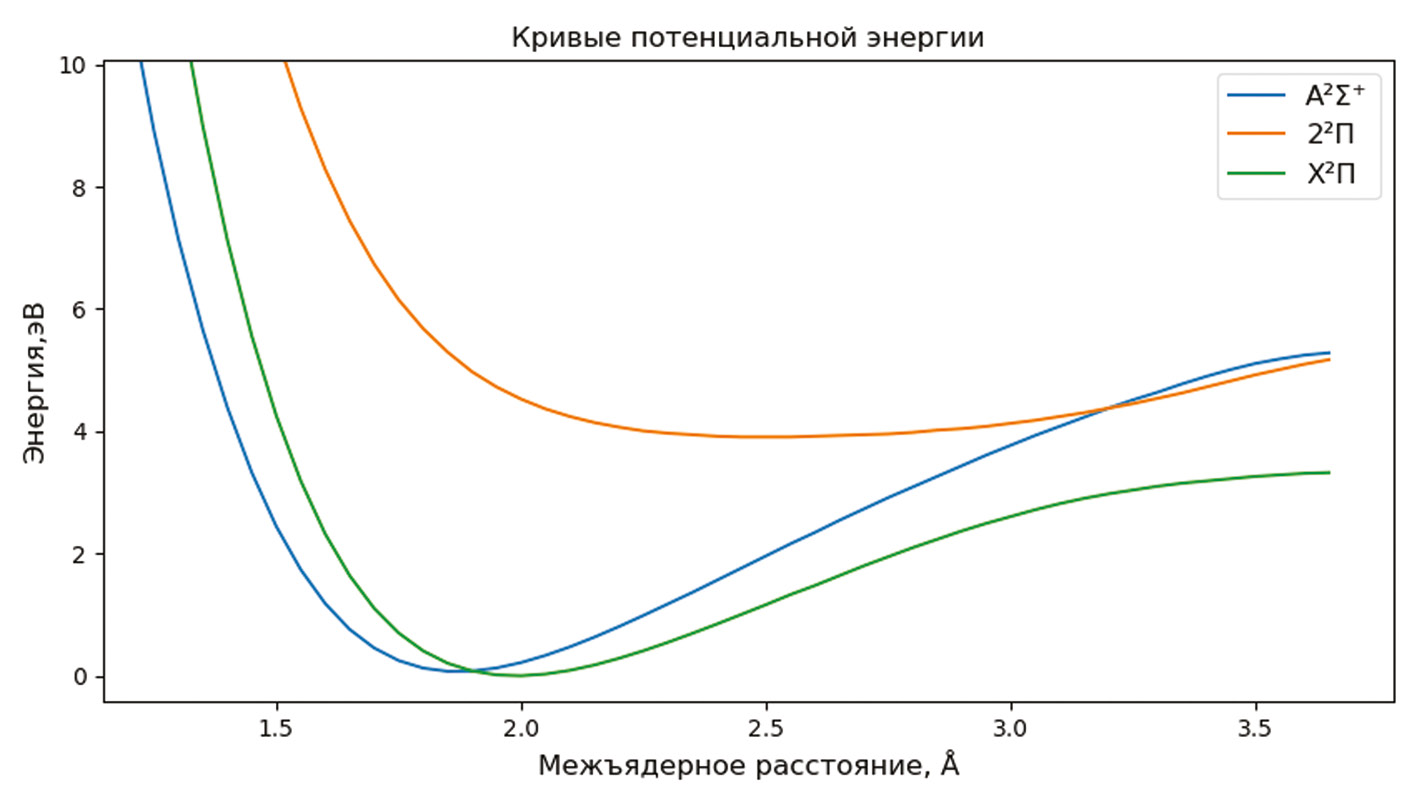 На графиках (рис. 1) представлены кривые потенциальной энергии, построенные нами для состояний Х2П, 22П и А2Σ+ молекулы СaO+, рассчитанные на суперкомпьютере «Сергей Королев» с помощью метода MRCI.