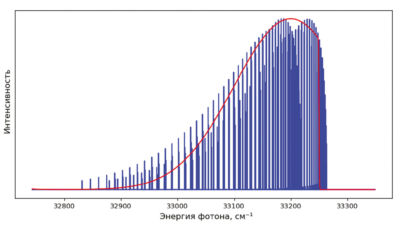 Рис. 2. Спектральная симуляция перехода Х2П(v = 0)–22П(v = 8)