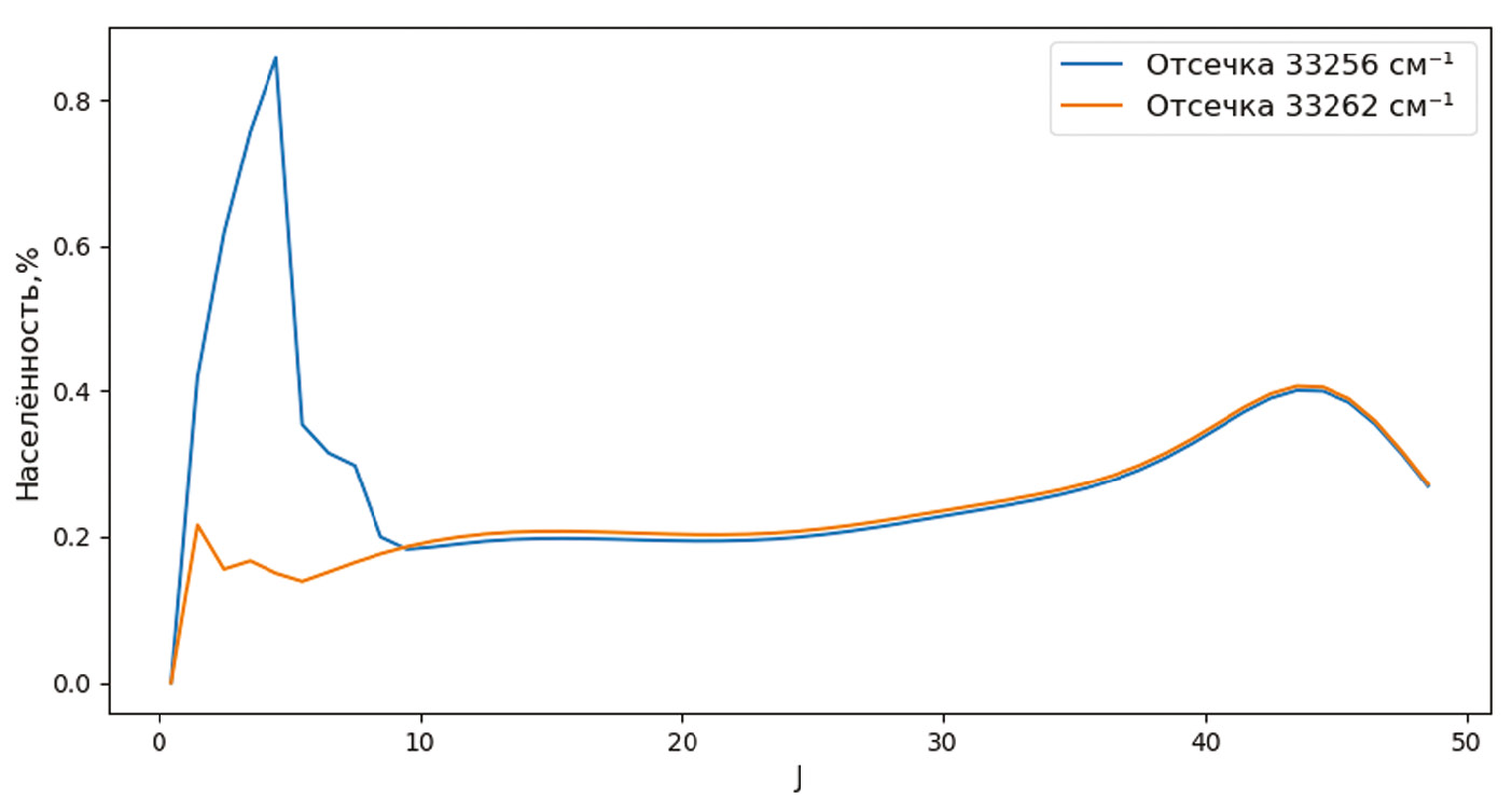Выводы. Такой эффект в результатах связан с тем, что при отсечке 33 256 см–1 несколько наиболее низколежащих вращательных уровней Х2П(v = 0) не перекрываются лазером, образуют «темные» состояния. В них перекачивается населенность из более высоколежащих вращательных уровней CaO+, таким образом, вращательные уровни молекулы оптически охлаждаются. Пик населенности Х2П(v = 0) 0,8 % достигается для J = 4,5. Общая населенность состояния Х2П(v = 0) составляет 25 %, населенность состояния А2Σ+(v = 0) составляет 57 %. Работы по решению этой задачи в данный момент ведутся.