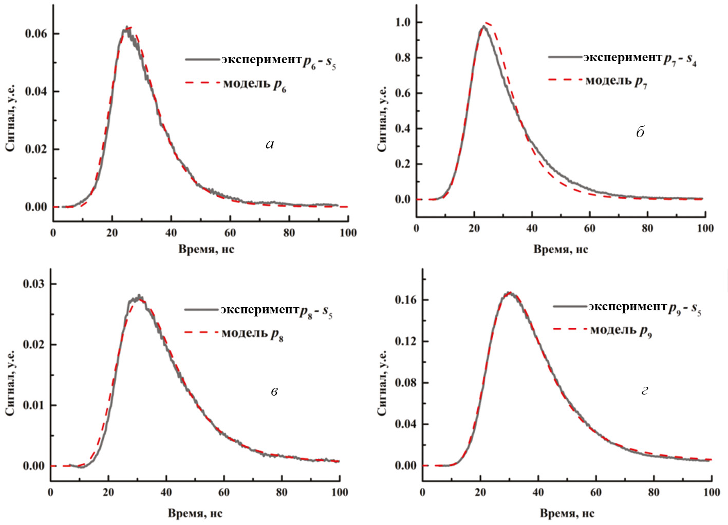 Результаты. На рис. 1, а–г сплошными линиями показаны типичные сигналы с трех каналов, настроенных на переходы 2p6 → 1s5 (а), 2p7 → 1s4 (б), 2p8 → 1s5 (в) и 2p9 → 1s5 (г) при накачке 1s5 → 2p7 на длине волны 772,4 нм, давлении в камере Р = 350 Торр и температуре газа в зоне разряда Т = 420 К. Регистрация сигналов с уровней 2p7 и 2p9 проводилась через один канал путем перестройки положения монохроматора с малым временным интервалом. Результаты моделирования представлены на рис. 1, а-г пунктирными линиями. Лучшее согласие модели со всеми 4 экспериментальными сигналами было достигнуто при следующих подобранных значениях суммарных констант скорости столкновительной релаксации между р уровнями: