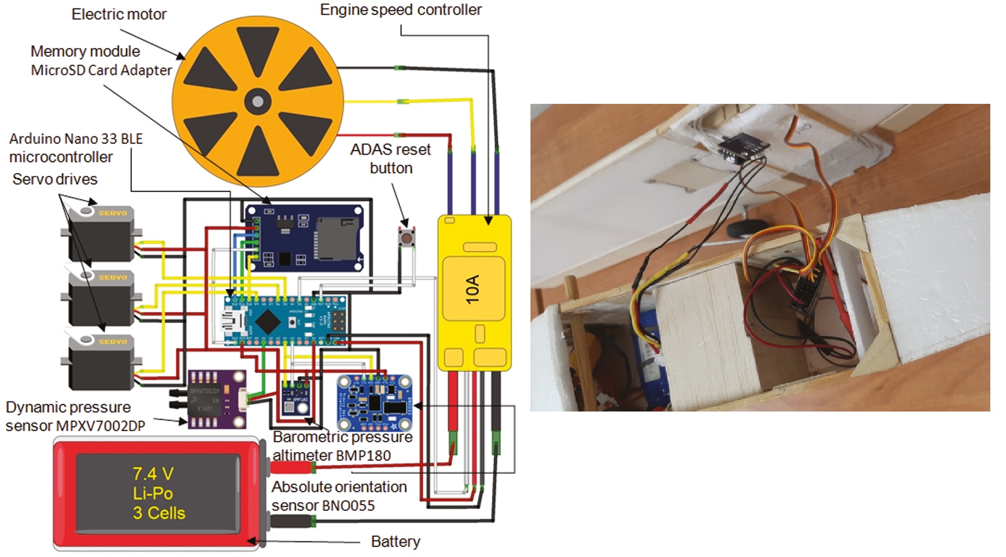 Methods. ADAS consists of the Arduino Nano 33 BLE microcontroller, BNO055 absolute orientation sensor, BMP180 barometric pressure altimeter and MPXV7002DP dynamic pressure sensor and mounts on small UAV (fig. 1, 2).