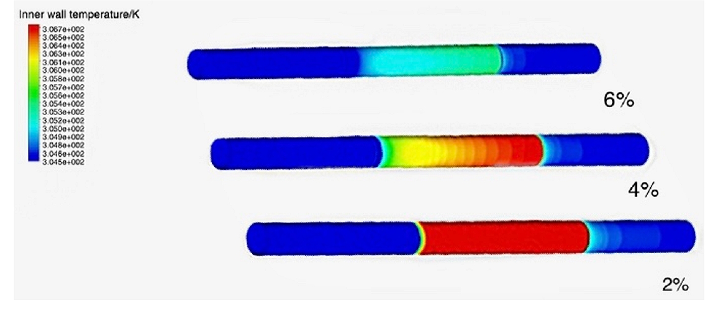 НеозаглавленРис. 1. Распределение температур поверхности трубы с различными концентрациями наножидкости в ней: 1 — концентрация наножидкости 6 %; 2 — концентрация наножидкости 4 %; 3 — концентрация наножидкости 2 %
