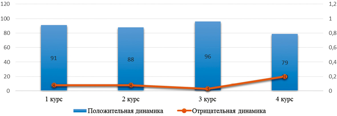 Рис. 1. Динамика изменений отношения студентов к профессиональным дисциплинам и к содержанию процесса обучения с 1 по 4 курс