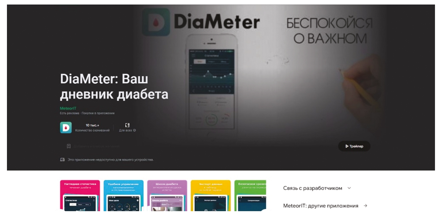 Приложение «DiaMeter: Ваш дневник диабета» от разработчика MeteorIT (рис. 1) — это дневник самоконтроля за диабетом, рассчитан на I и II тип.