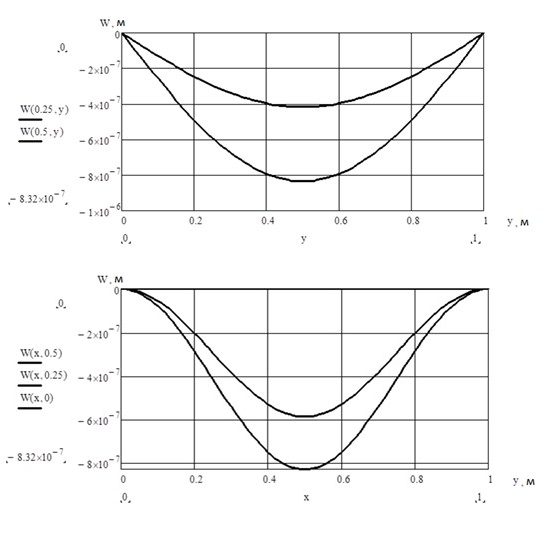 Результаты. При использовании системы компьютерного анализа Mathcad и полученного численным методом значение прогиба стальной пластинки с учетом ее граничных условий были выведены следующие графические зависимости прогиба от координатных значений при их значениях по осям Х и У принятые равными 0,25 и 0,5 (рис. 1).