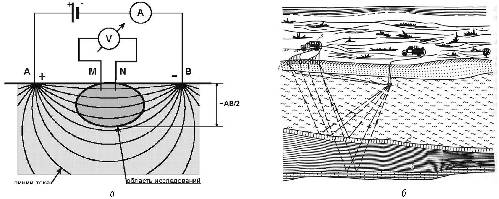 Рис. 1. Принципиальные схемы электроразведки (а) и сейсморазведки (б) методом отраженных волн
