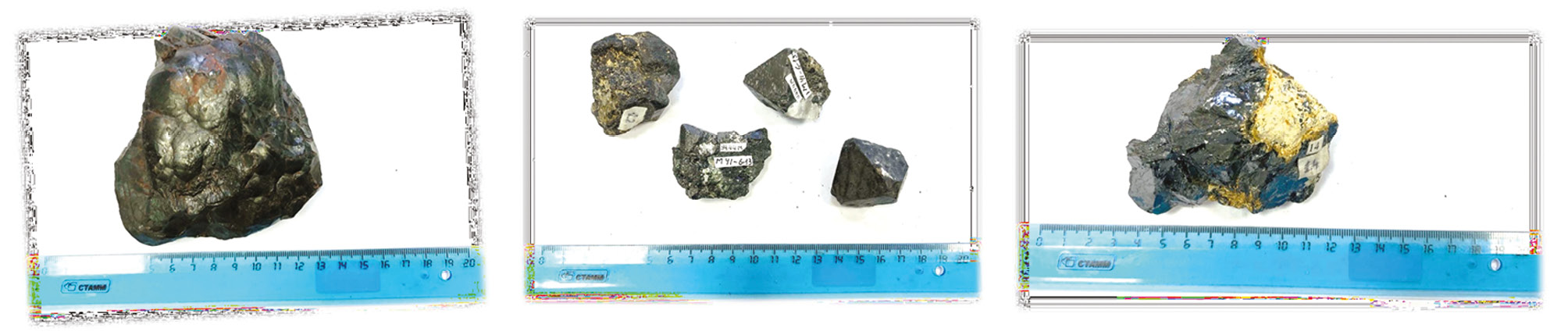 Результаты. Описаны главные образцы рудных минералов (рис. 1). Лимонит имеет коричнево-желтоватый цвет с ржавым оттенком. Его химический состав может включать гидроксиды и оксиды железа, кремнезем, глины и минеральные вещества. Различают несколько разновидностей лимонита в зависимости от его содержания минералов и свойств. В природе лимонит встречается в виде различных формаций, в том числе земляных пород, железистых конкреций, рудных жил. Магнетит является железным оксидом, обладает магнитными свойствами. Встречается в природе в виде мелких кристаллов и образует особые формации, называемые магнетитовыми аномалиями, которые используются при геологическом поиске месторождений полезных ископаемых. Вивианит имеет голубовато-зеленый цвет. Он обладает хорошей спайностью и может образовывать группы кристаллов со сложной геометрией. Также встречается в виде агрегатов, включений, пленок и корочек на других минералах. Широко используется в качестве фосфорного удобрения, также применяется в ювелирном искусстве.