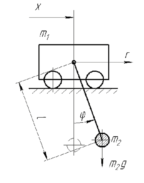 Для описания движения мостового крана была принята следующая расчетная схема (рис. 1). Мостовой кран представлен как тележка массой m1 на колесах. К ее центру масс на жестком невесомом стержне длиной l подвешен груз массой m2 [1]. Управляющая сила F толкает и останавливает тележку. Движение данной механической системы определяется в координатах перемещения тележки x угла отклонения стержня от вертикали φ.