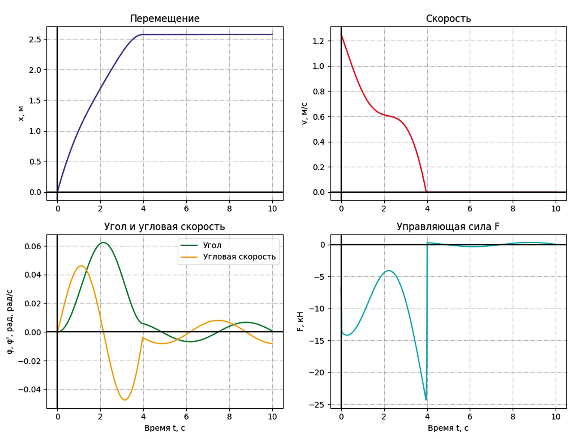 Результаты. С помощью разработанного метода было смоделировано торможения мостового крана грузоподъемностью 15 тонн со следующими исходными данными: