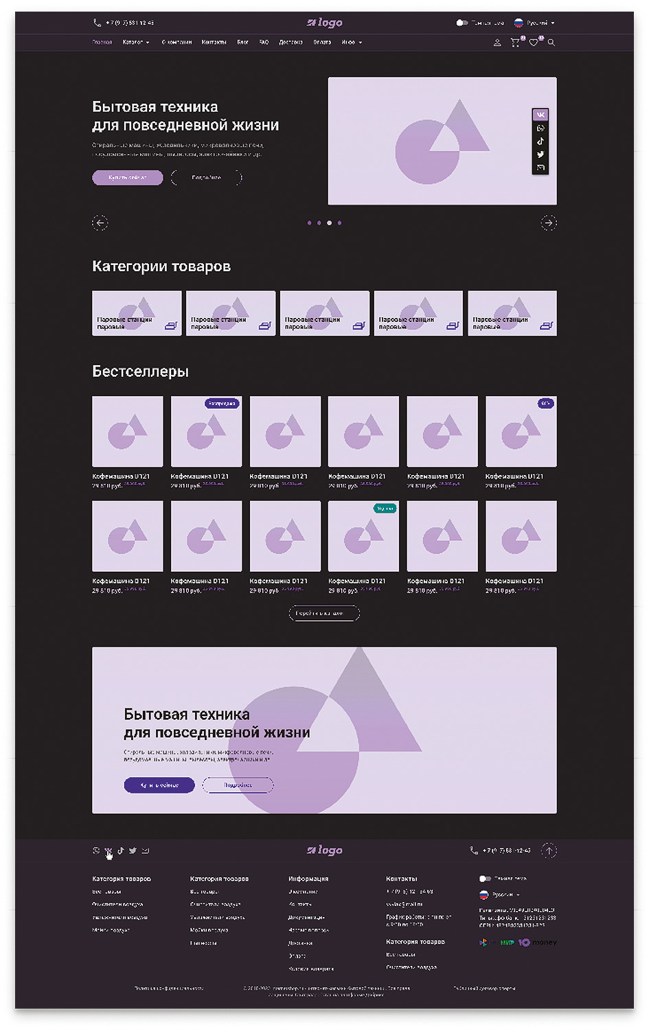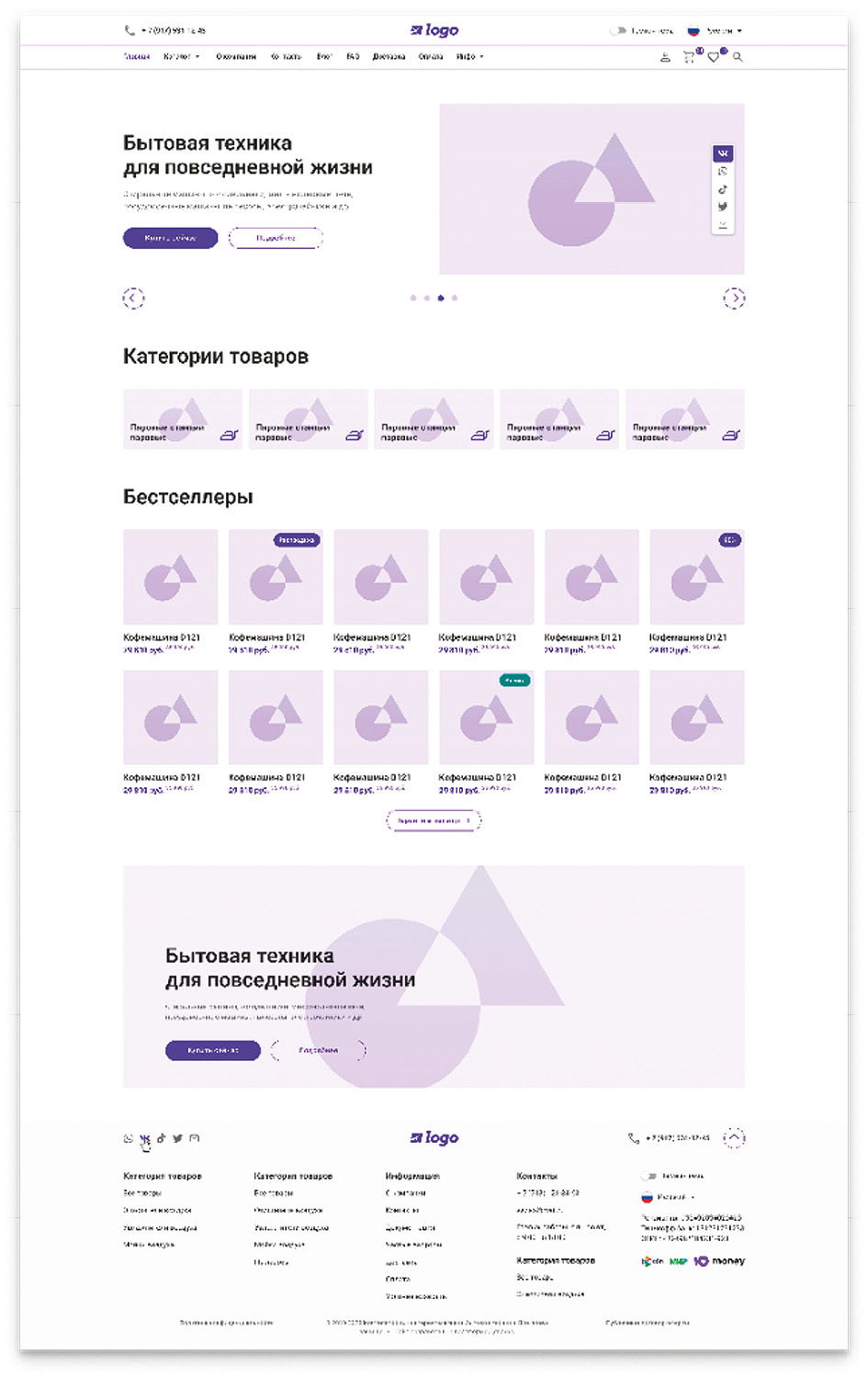 Результаты. Итог проделанной работы — библиотека дизайн-элементов, страниц, а также планшетной и мобильной версий интернет-магазина, которая находится в виртуальном облачном пространстве программы Figma, откуда ее можно скачать в виде файла на внешний носитель или отправить на нее ссылку, после перехода на которую можно будет в браузере скопировать дизайн-систему к себе в файлы аккаунта Figma и пользоваться ей, создавая дизайн-проекты интернет-магазинов различной тематики (при наличии зарегистрированного аккаунта Figma). Без авторизации в Figma конструктор будет доступен только для просмотра. Также в качестве апробации на основе разработанного конструктора был создан дизайн интернет-магазина по продаже бытовой техники. Использование библиотеки в работе дизайнера позволит, во-первых, оперативно и систематизировано собирать графические макеты дизайна интернет-магазинов различной тематики и наполненности; во-вторых, обеспечивать высокий уровень качества дизайна создаваемых интернет-магазинов благодаря проработанным дизайн-элементам и страницам в соответствии со стандартами UX дизайна;