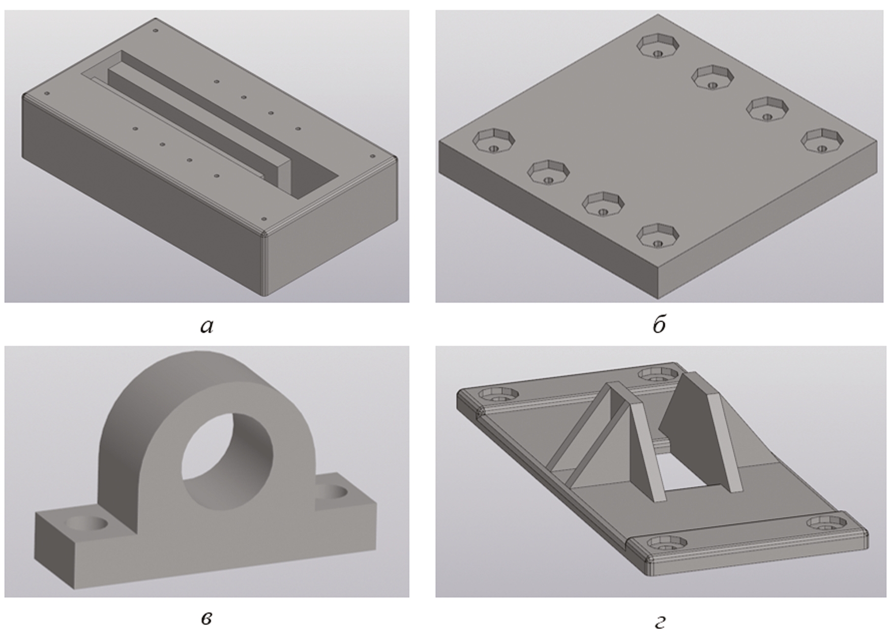 Рис. 1. 3D-модели элементов: а — основа; б — пластина фиксирующая;в — слидер; г — пластина направляющая