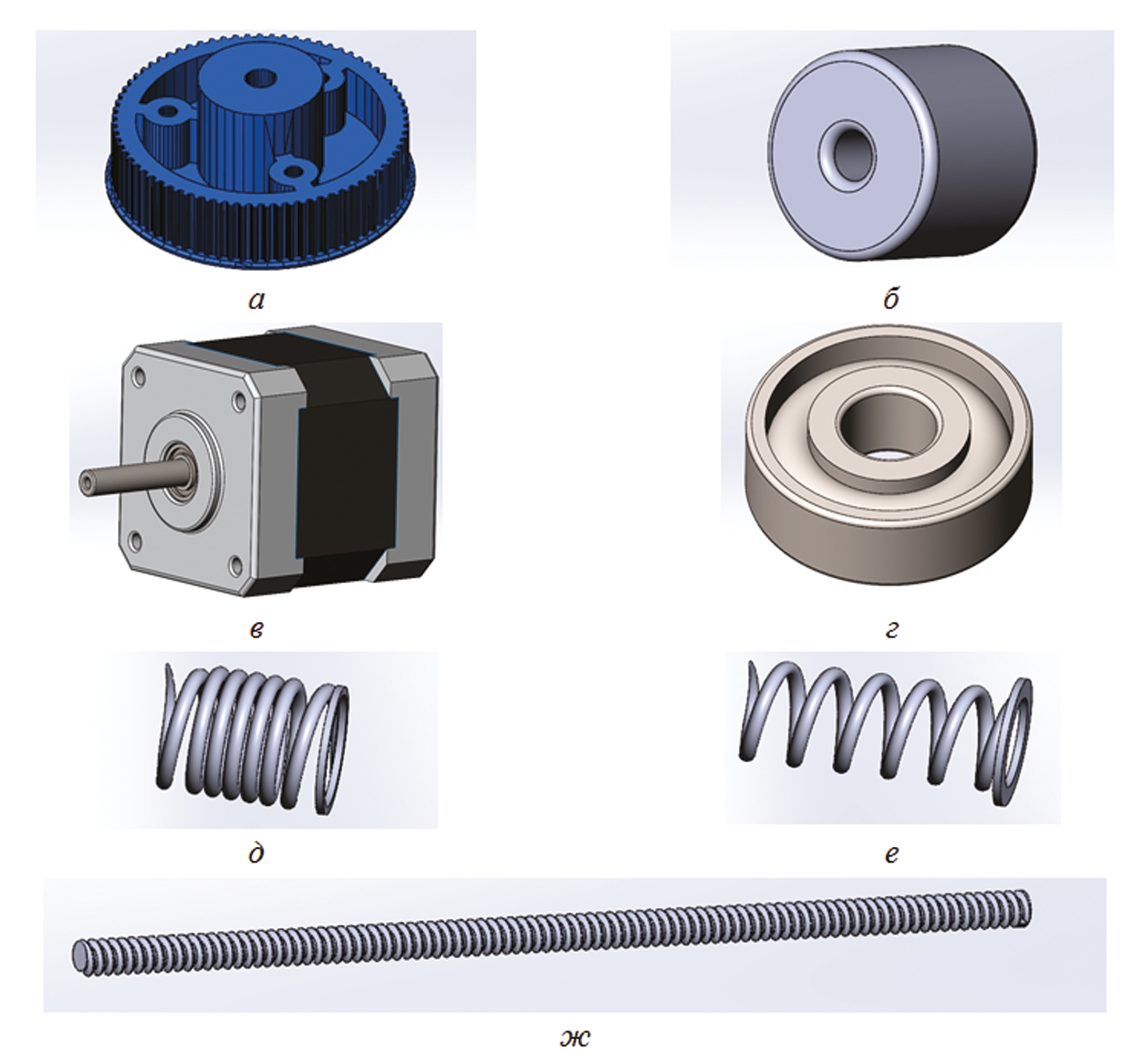 Рис. 2. 3D-модели элементов: а — ведомая шестерня; б — колесо полиуретановое; в — шаговый двигатель; г — подшипник; д — пружина в сжатом состоянии; е — пружина в разжатом состоянии; ж — шпилька резьбовая