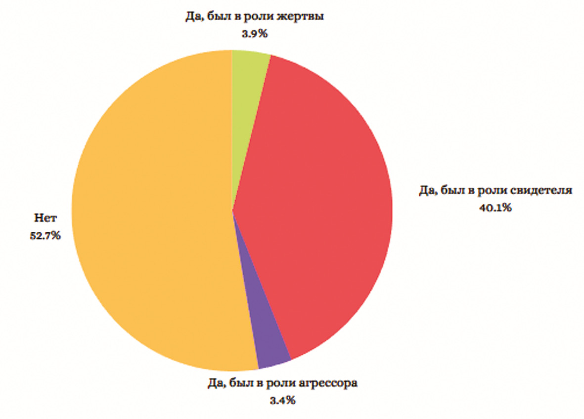 Среди студентов, относящихся к группе № 1, не замечали травли в повседневной жизни более 52 % обучающихся. Менее 4 % выступали в роли агрессора, примерно столько же являлись жертвами. 40 % являлись свидетелями буллинга.