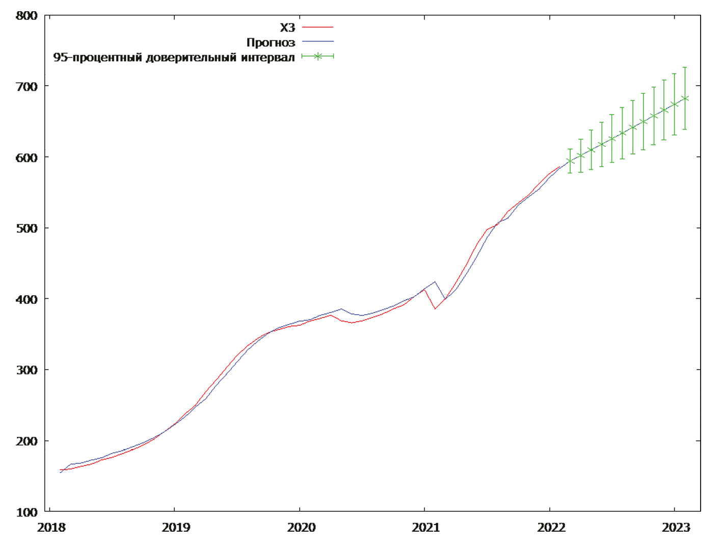 Следующий этап исследования включал в себя сбор информации по выбранным параметрам и составление массива статистических данных по месяцам за период с февраля 2018 года по февраль 2022 года [5]. Далее при помощи инструментов программы экономического моделирования Gretl было составлено 15 качественных моделей по каждому показателю деятельности для каждого банка соответственно. На основе полученных моделей был построен прогноз на следующие за февралем 2022 года 12 месяцев и проведено сравнение построенных моделей с реальными результатами банковского сектора на основе отчета Банка России, сделаны выводы о влиянии санкций на конкретные показатели и сегмент в целом.