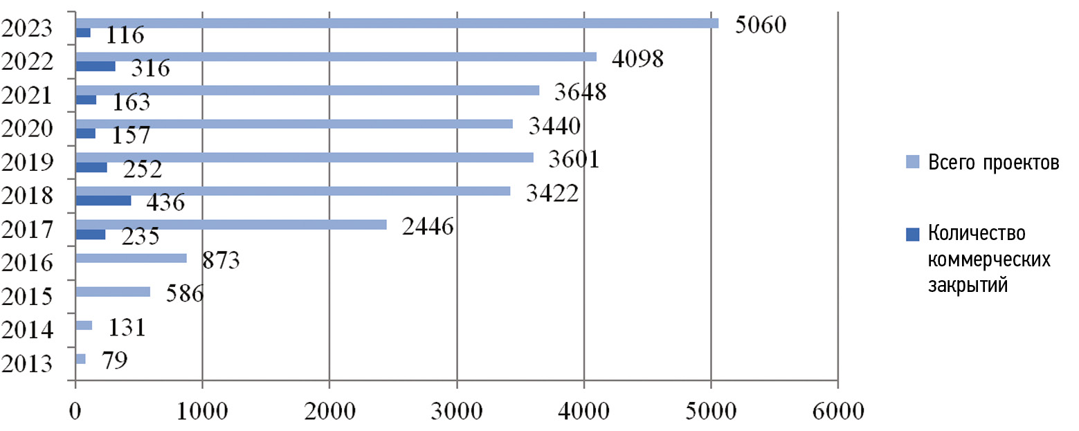 За период с 2013 по 2023 год наблюдался существенный рост числа ГЧП-проектов — с 79 до 5060, что отражает возрастающий интерес к этому инструменту. Однако динамика коммерческих закрытий характеризовалась колебаниями, достигнув пика в 2018 году (436 случаев), снизившись в последующие годы и вновь увеличившись в 2023 (до 115). Общий тренд роста ГЧП-проектов подчеркивает потенциал дальнейшего развития ГЧП в РФ, несмотря на отдельные сложности.