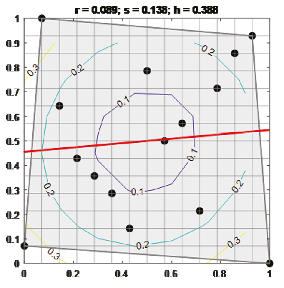 На рис. 1 точка определяется концентрациями двух компонентов смеси, наклон красной линии регрессии по точкам показывает величину коэффициента корреляции между концентрациями компонентов (r), контурный график описывает уровни значений функции размаха (h), а площадь закрашенного выпуклого многоугольника обозначает область заполнения ПЭ, так что незаполненность (s) является отношением незаполненной площади ПЭ к ее общей площади.