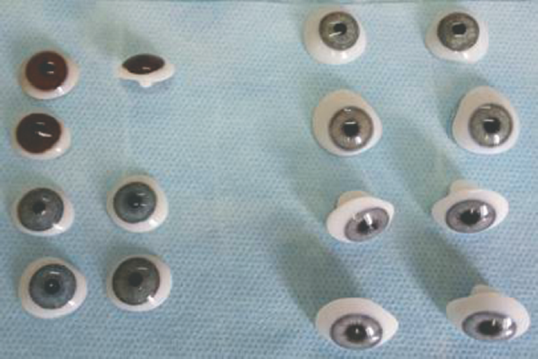 We used only individual eye prostheses for patients with congenital anophthalmia. We produced various complex-shaped prostheses with a thin flattened lower edge, including fungiform ones and those with a stand on their top and a small bottom depending on the cavity depth to reduce any retraction of the prosthesis and increase its stability. Eye prostheses should fit the conjunctival cavity to avoid excessive stretching of conjunctival tissue resulting in eyelid inversion. If complex-shaped plastic prostheses could not be carefully polished, we used individual glass prostheses.