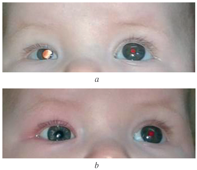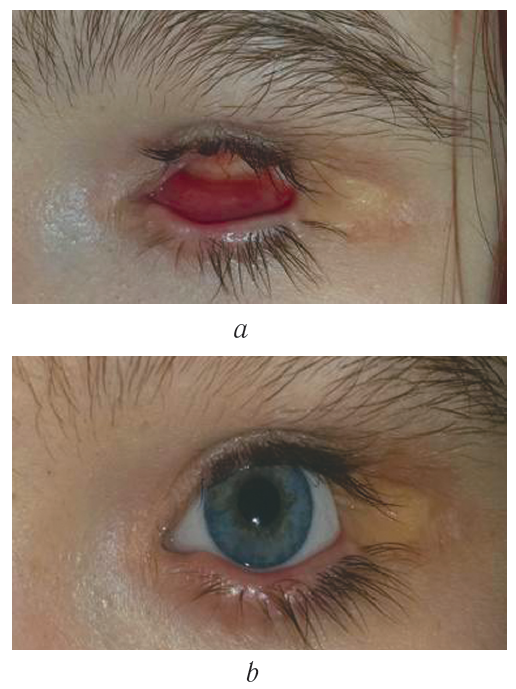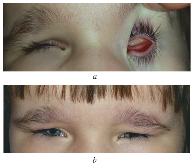 Рис. 4. Двусторонний врождённый микрофтальм у ребенка 3 лет: a — до протезирования; b — после протезирования