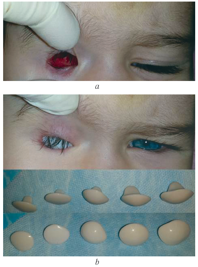 Рис. 6. Врождённый анофтальм у ребёнка 2 лет: а — результат нерационального хирургического вмешательства и позднего обращения на протезирование; b — протезирование индивидуальными конформаторами, недостаточная динамика растяжения тканей полости