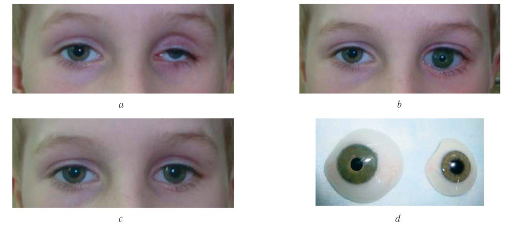 Fig. 8. Left-side congenital microphthalmia in a 7 y.o. child (a); result of inadequate prosthetics with an excessively large prosthesis (b); satisfactory result of prosthetics in the laboratory of the Center (c); proportional individual eye prosthesis on the right (d)