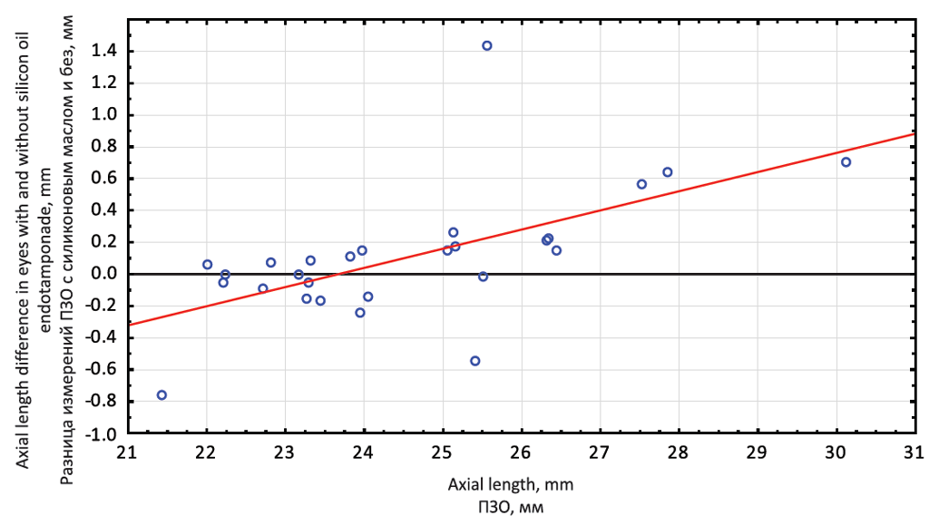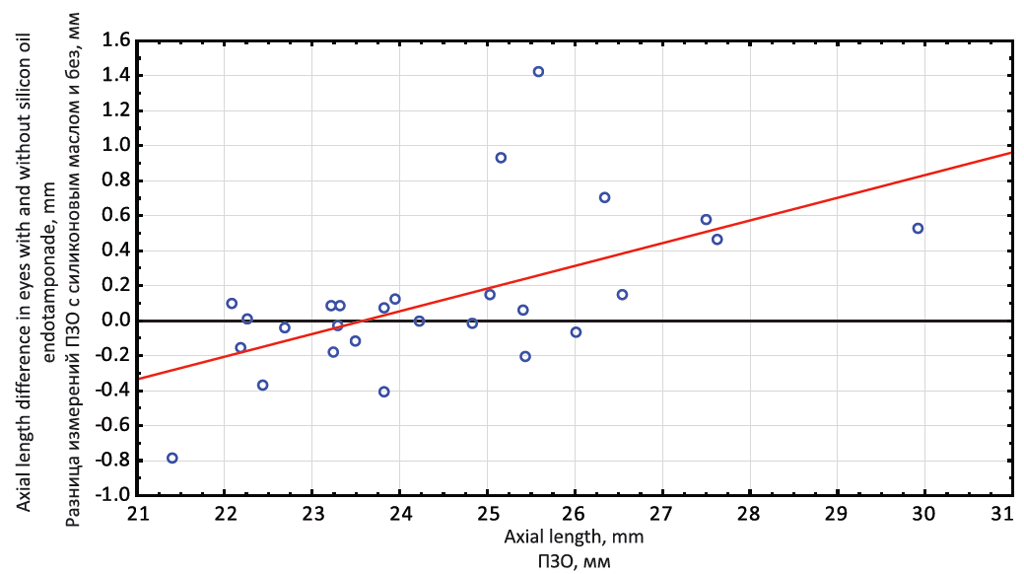 Materials and methods. The anteroposterior axis was measured in 27 eyes of 27 patients with silicone oil tamponade after surgical treatment of several vitreoretinal conditions. Using IOLMaster, the AL of eyes without silicone oil tamponade varied from 21.99 mm to 29.38 mm, Lenstar LS 900 biometry gave results from 21.96 mm to 29.41 mm.