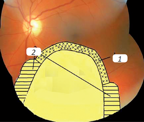 Рис. 1. Схема эндорезекции меланомы хориоидеи по зонам: 1 — центральная зона шириной 0,5 мм; 2 — периферическая зона шириной 1 мм