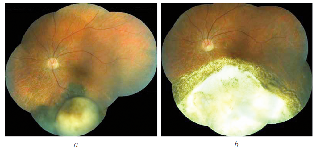 Рис. 3. Фотографии глазного дна до и после первичной эндорезекции меланомы хориоидеи: а — до лечения; b — через 18 мес.