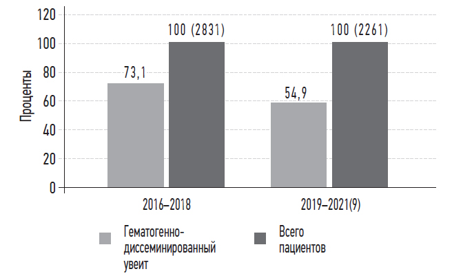 Число больных туберкулёзными гематогенными увеитами с 01.01.2019 по 01.10.2021 составило 1242 (55 %) из 2261 человека — общего числа поступивших в санаторий пациентов, что достоверно сократилось в сравнении с предшествующими тремя годами — соответственно 2069 (75 %) из 2747 (рис. 1).