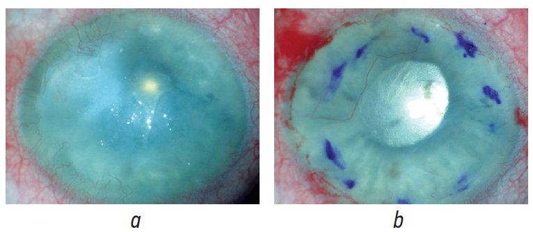 Fig. 1. Patient M. The stage IV of bullous keratopathy: а — severe epithelial-stromal edema of the cornea with bullous epithelium; b — the epithelium is removed; severe corneal stromal edema, gross impairment of corneal transparency are present