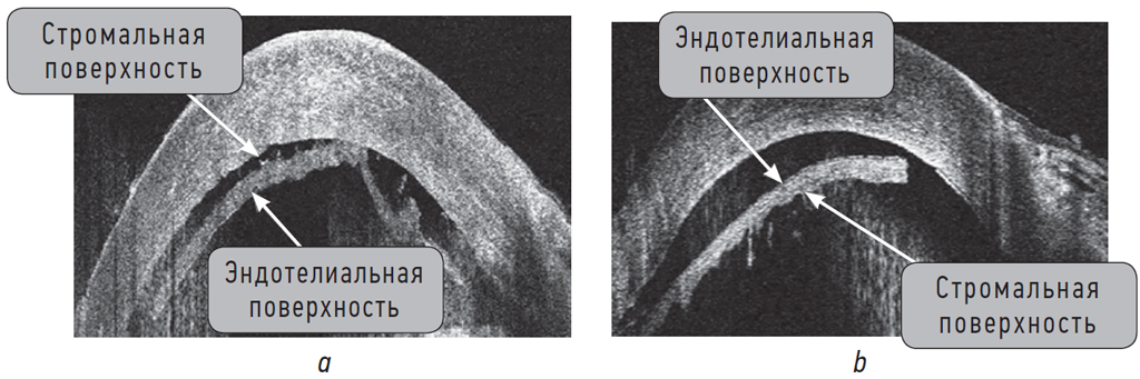 Наличие объективного контроля в виде интраоперационной ОКТ позволило во всех случаях чётко дифференцировать стромальную и эндотелиальную поверхность заднего послойного трансплантата, располагающегося в передней камере глаза (рис. 4).