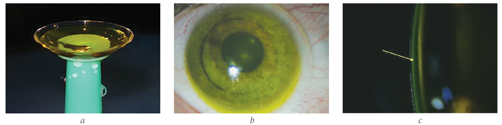 Fig. 1. A method for cornea saturation with a photosensitizer using a miniscleral lens: a – the posterior aspect of the miniscleral lens is filled with photosensitizer solution; b – regular distribution of the photosensitizer over the entire surface of the cornea; с – biomicroscopic image – the arrow shows the space under the lens filled with photosensitizer