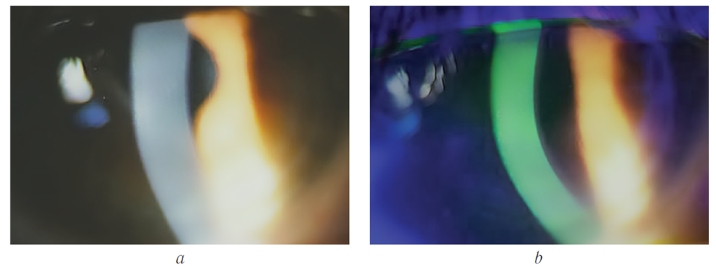 Fig. 3. Cornea of the right eye in a patient with a secondary keratectasia after one month wear of miniscleral lens filled with non-preserved solution of sodium hyaluronate: a – significant decrease in corneal punctuate epitheliopathy (fluorescein staining); b – biomicroscopy with a blue cobalt filter