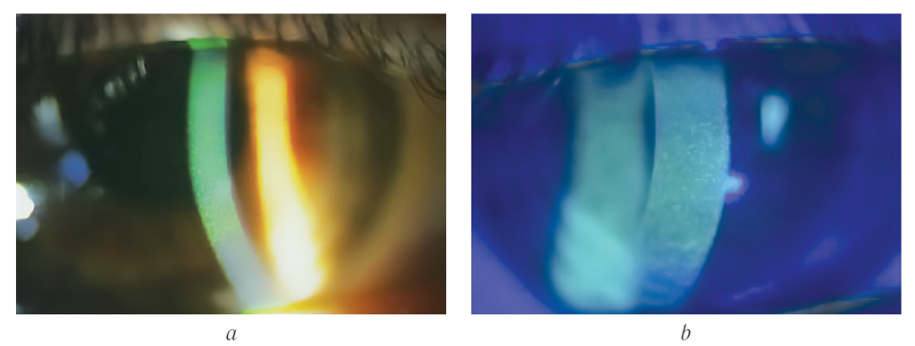 Рис. 3. Роговица правого глаза у пациента с вторичной кератэктазией через месяц ношения минисклеральной линзы, заполненной бесконсервантным раствором гиалуроната натрия: a — значительное уменьшение точечной эпителиопатии роговицы (окраска раствором флюоресцеина); b — биомикроскопия в синем кобальтовом фильтре